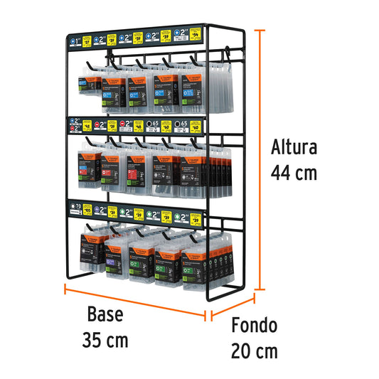 Proveedor:FosetExhibidor con monomando TBM-45, Foset, 55994Base fabricada en lámina calibre 20 con acabado en pintura electrostática color negro mate Adaptación para colgarse en panel ranurado...