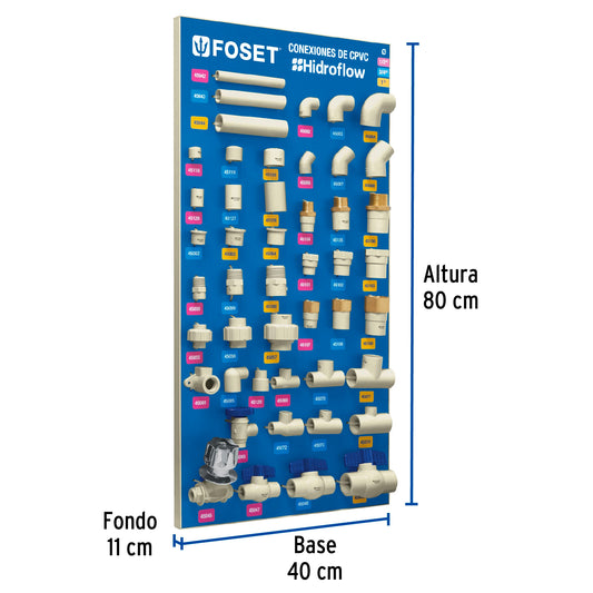 Proveedor:FosetExhibidor con conexiones de CPVC, Foset, 55787Tablero fabricado con MDF con cubrecantos de PVC blanco Para exhibir el producto aprovechando al máximo los espacios Incluye accesorios...