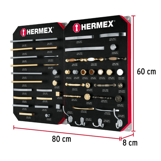 Proveedor:HermexExhibidor con jaladeras y perillas, 1 tablero, Hermex, 53001Base estructurada en MDF con cubierta de melamina Con accesorios para anclarse en pared, se sostiene con placas de aluminio...