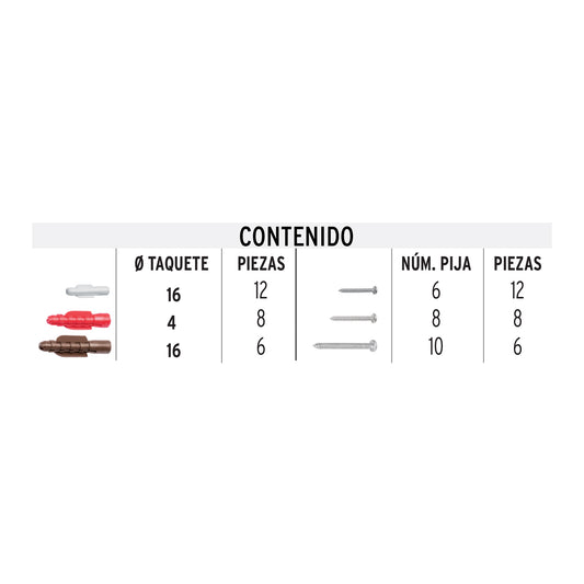 Proveedor:FieroEstuche 26 taquetes 3/16', 1/4', 5/16', c/pijas #6, #8, #10 Caja con 6, 49770Pija para lámina cabeza combinada de acero galvanizado y taquete plástico Taquetes con anclas que evitan el giro Cinturones de...