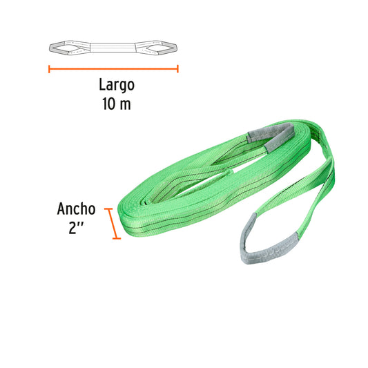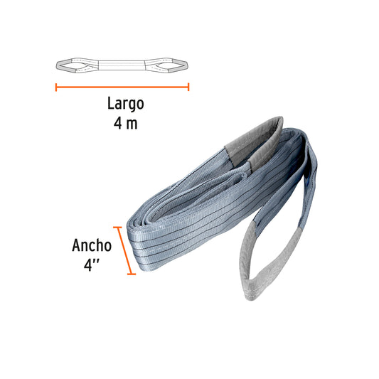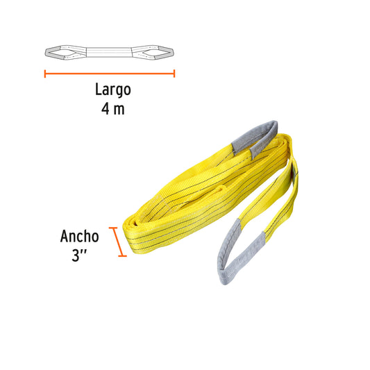 Proveedor:TruperEslinga de poliéster, ojo a ojo, 4' x 8 m, Truper, 17878Banda plana 100% poliéster Capacidad de carga 4,000 kg Ojos planos reforzados No daña la superficie de objetos Para levantar...