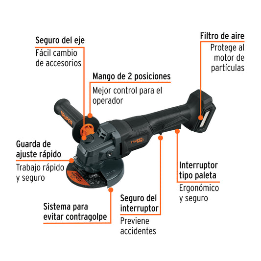 Proveedor:TruperEsmeriladora 4-1/2', 20V, 1 batería 4Ah, PRO, 102872Motor libre de carbones (brushless), no requiere mantenimiento y evita el desgaste prematuro Mango auxiliar ajustable a 2 posiciones para...