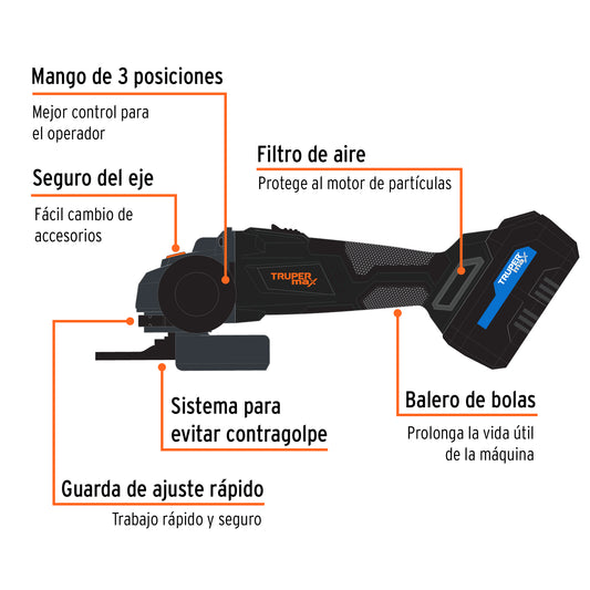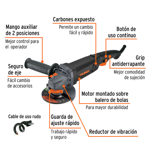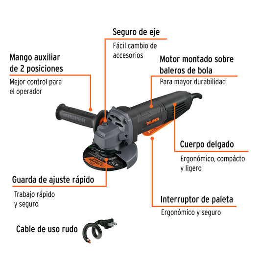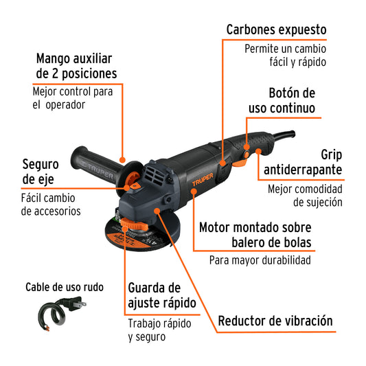 Proveedor:TruperEsmeriladora angular 4-1/2', 750W, TRUPER ERGO PRO, 13931Motor de 750 W, montado sobre balero de bolas para mayor vida útil y mejor desempeño Mango auxiliar ajustable a...
