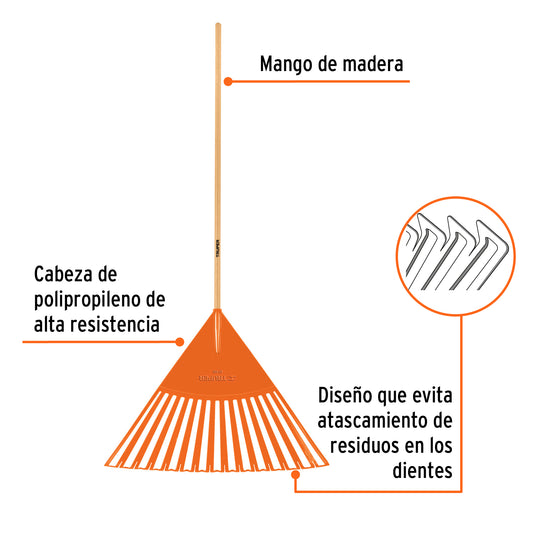 Proveedor:TruperEscoba para alto volumen de hojas, Truper Caja con 6, 103367Cabeza de polipropileno de alta resistencia El diseño evita atascamiento de residuos en los dientes Mango de madera Para recoger...