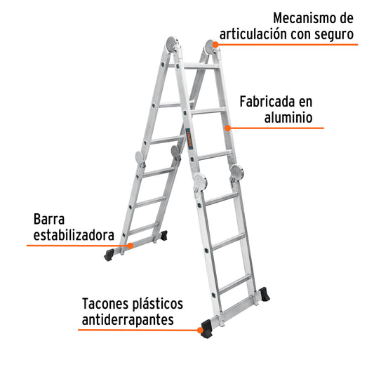 Proveedor:TruperEscalera multiposición 12 peldaños, Tipo I, Truper, 100495Fabricada en aluminio Mecanismo de articulación con seguro Barra estabilizadora Plegable para fácil almacenamiento y transportación Tacones plásticos antiderrapantes