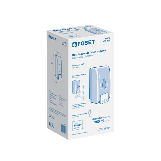Proveedor:FosetDosificador de ABS para jabón espuma, blanco, FOSET, 45856Cuerpo de ABS Botón dispensador Depósito rellenable Funciona con jabón en espuma Ventana que indica el nivel de jabón