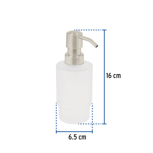 Proveedor:FosetDispensador de jabón de repuesto en acabado satín, Riviera, 45216Cuerpo fabricado de vidrio esmerilado Dosificador de ABS con acabado satín