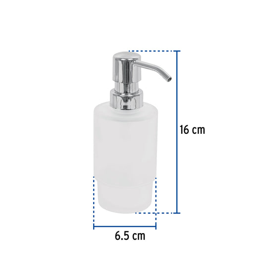 Proveedor:FosetDispensador de jabón de repuesto en acabado cromo, Riviera, 45215Cuerpo fabricado de vidrio esmerilado Dosificador de ABS con acabado cromo