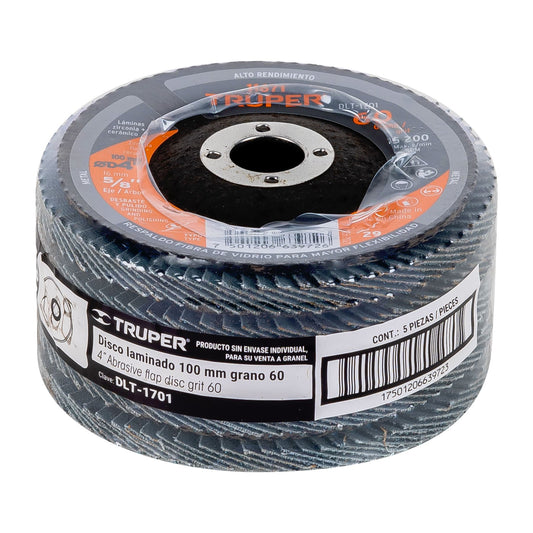 Proveedor:TruperDisco 4-1/2' laminado grano 60 centro 7/8', Truper Caja con 5, 11674Fabricado con lija de zirconia y cerámica, con respaldo fibra de vidrio para mayor flexibilidad Se recomienda mantener el disco...