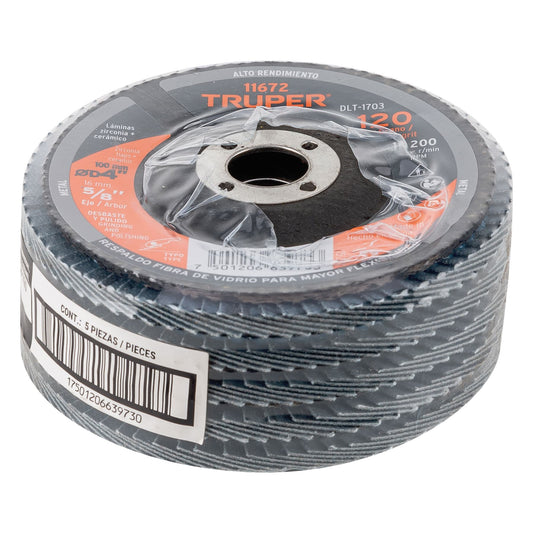 Proveedor:TruperDisco laminado 4', grano 120 centro 5/8', Truper Caja con 5, 11672Fabricado con lija de zirconia y cerámica, con respaldo fibra de vidrio para mayor flexibilidad Se recomienda mantener el disco con...