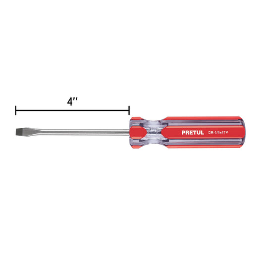 Proveedor:PretulDesarmador plano 1/4 x 4' mango de PVC, Pretul Caja con 6, 21459Barra de acero al carbono Mango de PVC Marcado y código de color para fácil identificación de medida y punta...