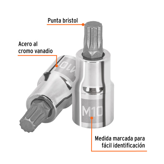 Proveedor:TruperDado punta larga bristol M10, cuadro 1/2', Truper Caja con 6, 101301Fabricado en acero al cromo vanadio con acabado pulido espejo resistente a la oxidación y de fácil limpieza Sistema de sujeción...