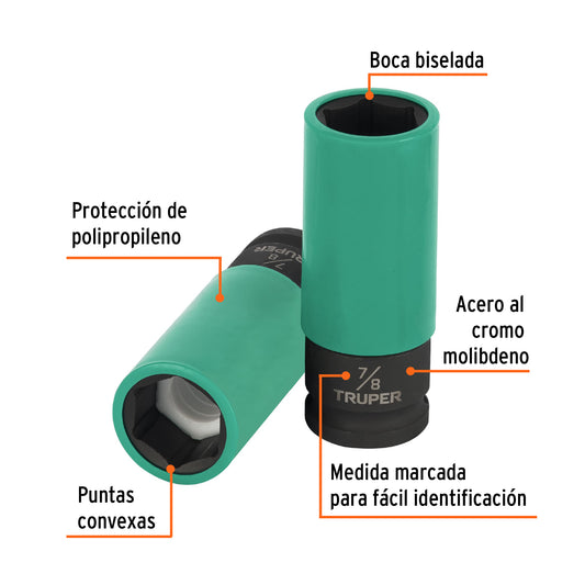 Proveedor:TruperDado largo impacto prot. plást. 7/8', 6 puntas, cuadro 1/2' Caja con 6, 100929Fabricado en acero al cromo molibdeno con acabado fosfatado resistente a la corrosión Sistema de sujeción Truper-Drive con puntas convexas que...