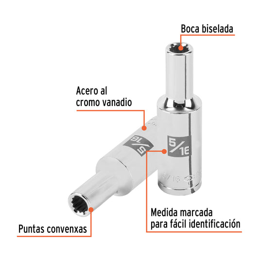 Proveedor:TruperDado largo de 5/16' 12 puntas, cuadro 1/2', Truper Caja con 6, 101001Fabricado en acero al cromo vanadio con acabado pulido espejo resistente a la oxidación y de fácil limpieza Sistema de sujeción...
