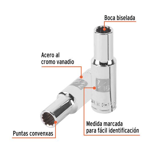 Proveedor:TruperDado largo de 7/16' 12 puntas, cuadro 1/2', Truper Caja con 6, 101003Fabricado en acero al cromo vanadio con acabado pulido espejo resistente a la oxidación y de fácil limpieza Sistema de sujeción...