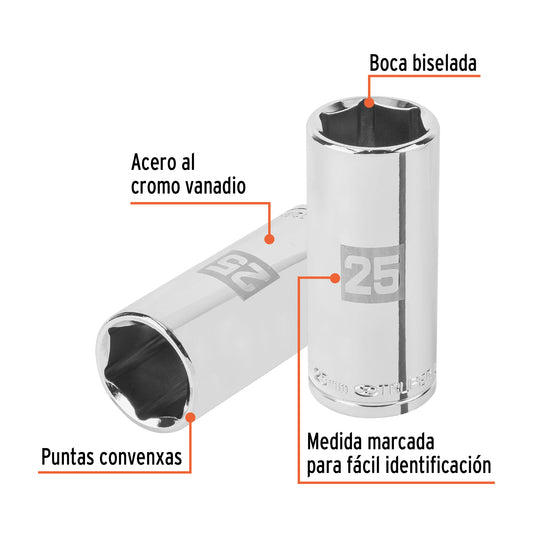 Proveedor:TruperDado largo de 25 mm, 6 puntas, cuadro 1/2', Truper Caja con 6, 101013Fabricado en acero al cromo vanadio con acabado pulido espejo resistente a la oxidación y de fácil limpieza Sistema de sujeción...