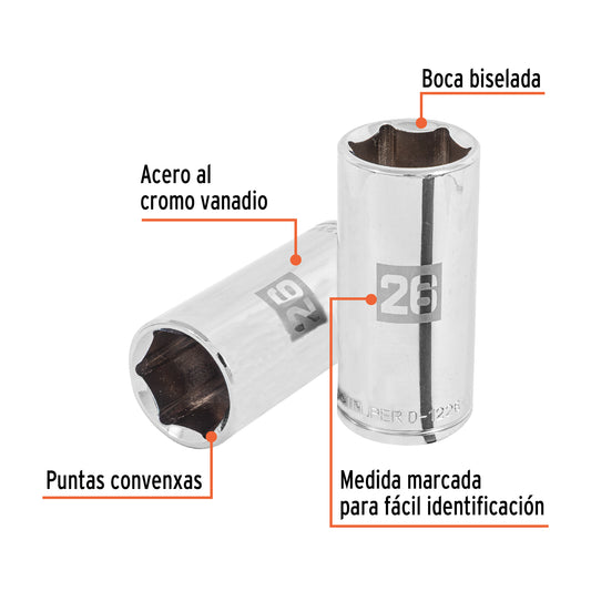 Proveedor:TruperDado largo de 26 mm, 6 puntas, cuadro 1/2', Truper Caja con 6, 101014Fabricado en acero al cromo vanadio con acabado pulido espejo resistente a la oxidación y de fácil limpieza Sistema de sujeción...