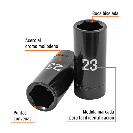 Proveedor:TruperDado largo impacto de 23 mm, 6 puntas, cuadro 1/2', Truper Caja con 6, 100922Fabricado en acero al cromo molibdeno con acabado fosfatado resistente a la corrosión Sistema de sujeción Truper-Drive con puntas convexas que...