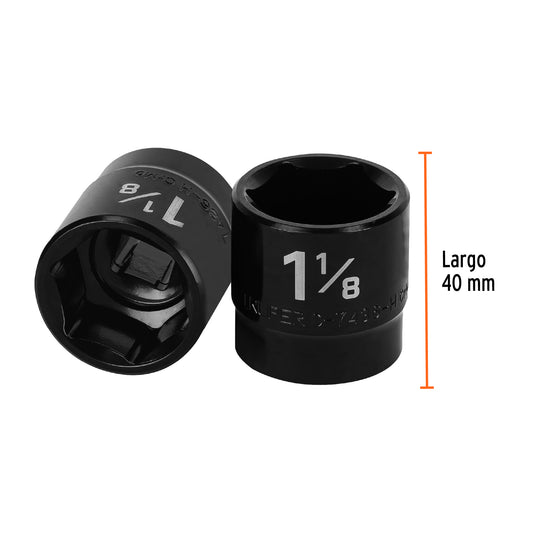 Proveedor:TruperDado de impacto de 1-1/8', 6 puntas, cuadro 1/2', Truper Caja con 6, 13398Fabricado en acero al cromo molibdeno con acabado fosfatado resistente a la corrosión Sistema de sujeción Truper-Drive con puntas convexas que...