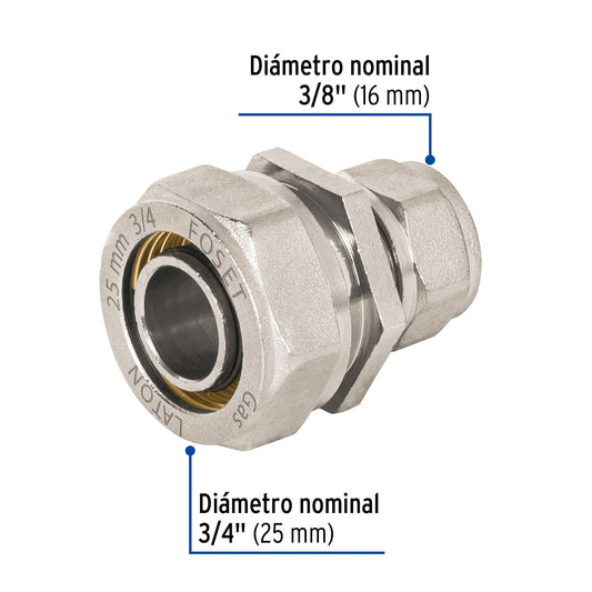 Proveedor:FosetCople de compresión reducido para PEALPE, 3/4' x 3/8', Foset Caja con 4, 45916Cuerpo de latón niquelado Resistencia a la corrosión Conexión por compresión, sin soldadura Compatible con tubería multicapa PE-AL-PE para gas...