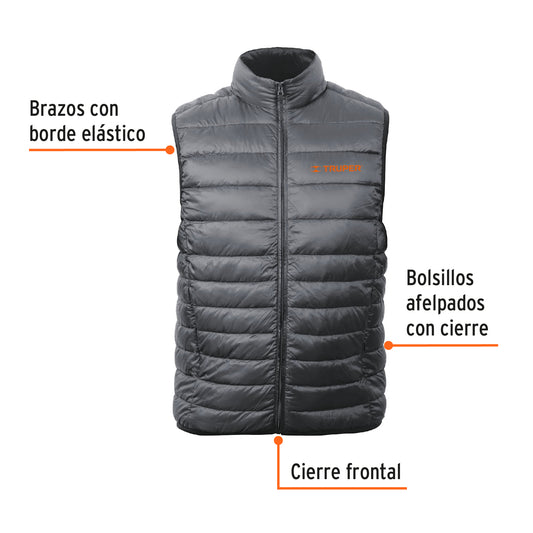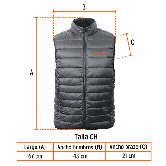 Proveedor:TruperChaleco de plumas para hombre, gris, M, Truper, 69997Exterior y forro 100% nylon Relleno 90% plumón, 10% pluma de ganso Diseño compactable para guardarse en bolsa y trasladar...