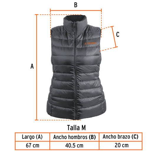 Proveedor:TruperChaleco de plumas para mujer, gris, M, Truper, 69994Exterior y forro 100% nylon Relleno 90% plumón, 10% pluma de ganso Diseño compactable para guardarse en bolsa y trasladar...