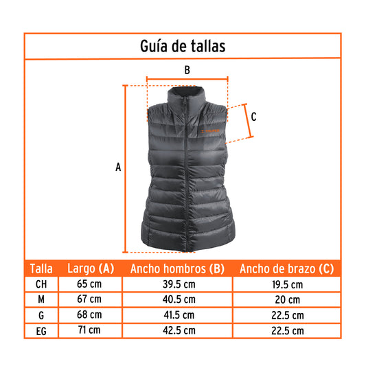 Proveedor:TruperChaleco de plumas para mujer, gris, G, Truper, 69995Exterior y forro 100% nylon Relleno 90% plumón, 10% pluma de ganso Diseño compactable para guardarse en bolsa y trasladar...