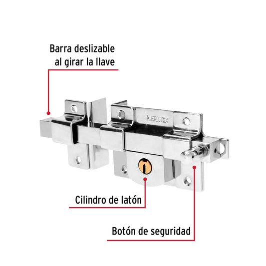 Proveedor:HermexCerradura de barra fija, derecha, blíster, Hermex Caja con 3, 43506Cilindro de latón sólido con 5 pernos para mayor resistencia contra robos Cerradura de barra fija, la barra se acciona al girar...