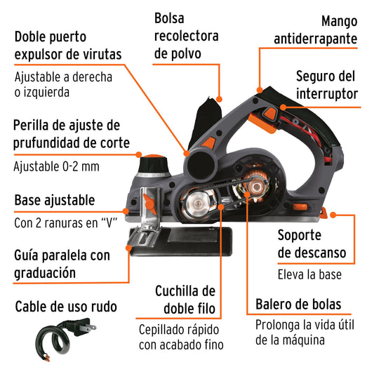 Proveedor:ExpertCepillo eléctrico 3-1/4' 720 W, industrial, Truper, 13442Motor de 720 W, montado sobre balero de bolas para mayor vida útil y mejor desempeño 2 cuchillas de doble...