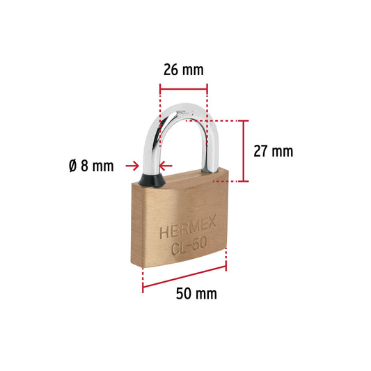 Proveedor:HermexCandado de latón 50 mm gancho corto en blíster, Hermex Caja con 3, 43430Cuerpo de latón con acabado pulido y gancho corto de acero con acabado cromado Seguro tipo perno, seguridad estándar Cilindro de...