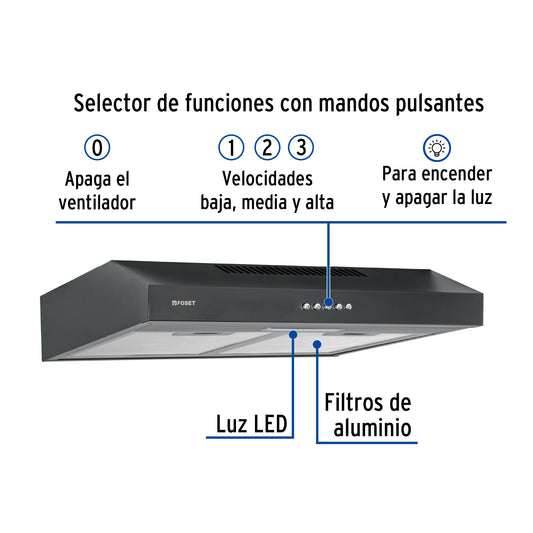 Proveedor:FosetCampana extractora 60 cm, empotrable, negra, Foset, 49488Modo de extracción aire Modo recirculación que purifica el aire de grasa y olores Filtros de aluminio desmontables y lavables Panel...