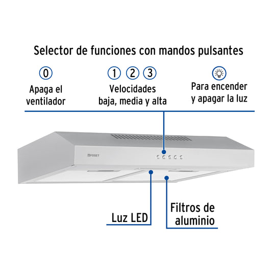 Proveedor:FosetCampana extractora 60cm, empotrable, acero inoxidable, Foset, 46536Modo de extracción aire Modo recirculación que purifica el aire de grasa y olores Filtros de aluminio desmontables y lavables Panel...