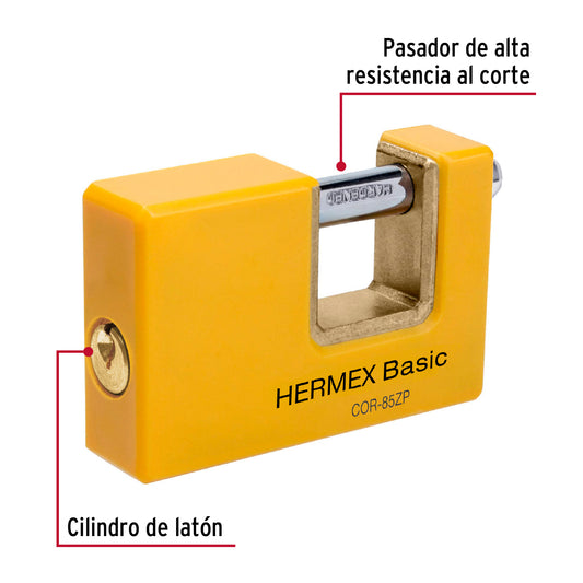 Proveedor:HermexCandado antipalanca 85 mm cuerpo metálico, Hermex Basic Caja con 3, 27088Cuerpo metálico recubierto de ABS resistente a impactos Seguro tipo perno seguridad estándar Cilindro de latón sólido con 4 pines...