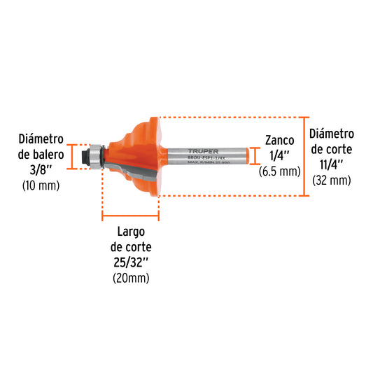 Proveedor:TruperBroca para router, bocel cuarto, 1-1/8' con balero, Truper Caja con 3, 11485Cuerpo de acero al cromo y cuchilla de carburo de tungsteno Guía de balero que facilita el recorrido en bordes...