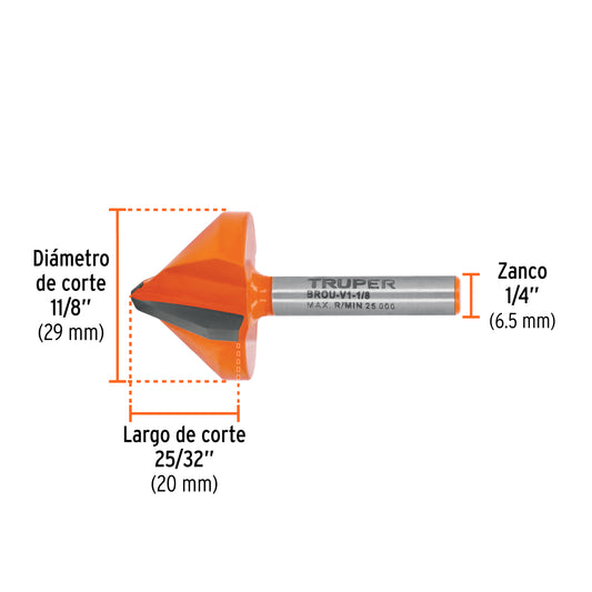 Proveedor:TruperBroca para router, corte en 'V', 7/8', Truper Caja con 3, 11467Cuerpo de acero al cromo y cuchilla de carburo de tungsteno Zanco de 1/4" Para aplicaciones de fresado en router...