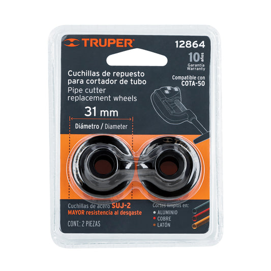 Proveedor:TruperBlíster con 2 cuchillas para cortador de tubo COTA-50 Caja con 6, 12864Cuchillas de acero de alta aleación Cortes limpios para tubos de cobre, latón y aluminio Para cortador de tubo modelo COTA-50 marca...