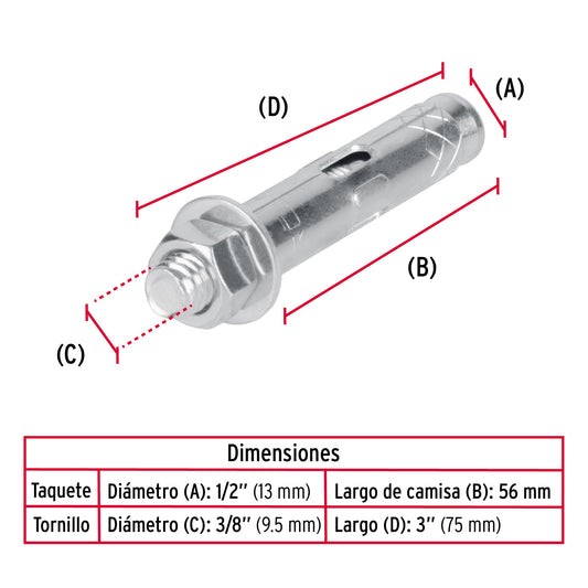 Proveedor:Fierotaquetes expansivos de 3/8' con tornillo, Fiero Caja con 50, 47339Fabricados en acero con acabado galvanizado Taquete montado Para fijar en concreto