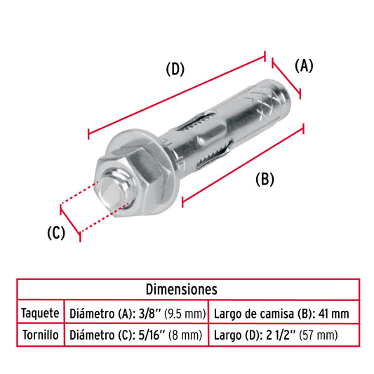 Proveedor:Fierotaquetes expansivos de 5/16' con tornillo,Fiero Caja con 100, 47320Fabricados en acero con acabado galvanizado Taquete montado Para fijar en concreto