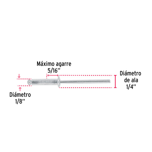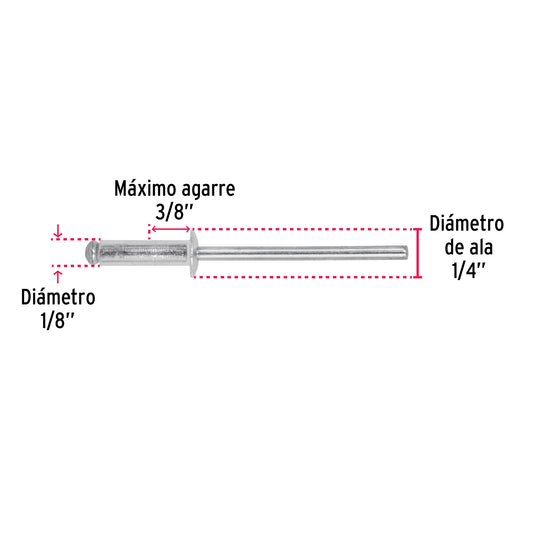 Proveedor:FieroBolsa con 50 remaches 1/8' x 1/2' de aluminio, ala 1/4 Caja con 10, 44523Cuerpo de aluminio con acabado natural Clavo de acero Para unir planchas metálicas, perfiles, hojalatería, electrodomésticos y estructuras en general...