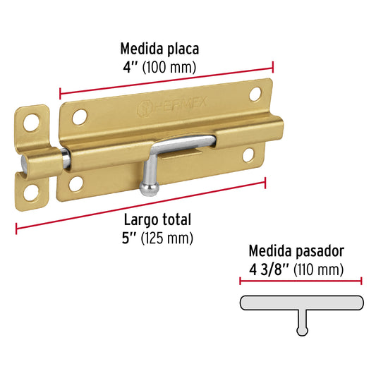 Proveedor:HermexPasador de barril de acero latón 5', Hermex Caja con 6, 45720Fabricado en acero Acabado latonado Para uso horizontal y vertical