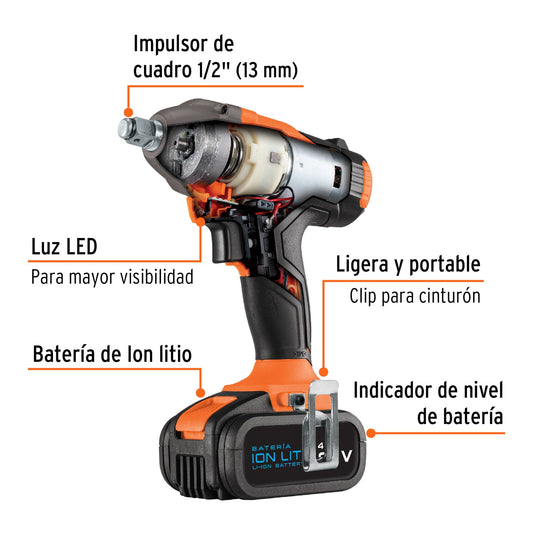 Proveedor:TruperLlave impacto inal. 1/2', 20V, 1 bat. 4Ah, 1 carg. PRO, 101607