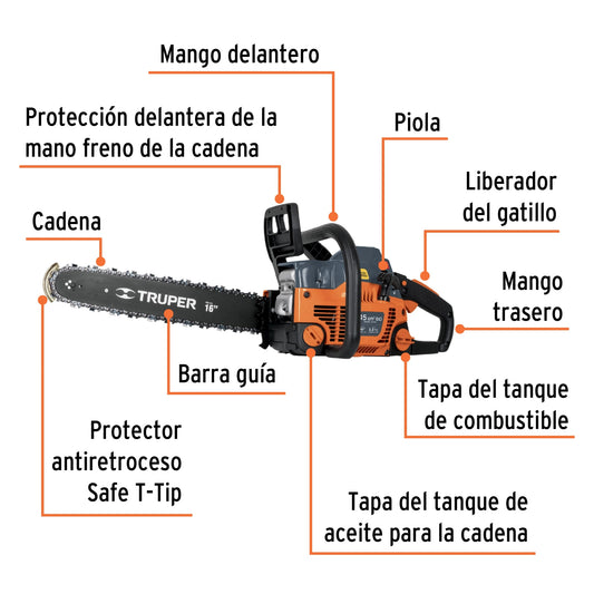 Proveedor:TruperMotosierra 45 cc a gasolina con barra de 16', Truper, 16620Motor de 2.2 HP a gasolina de 2 tiempos Sistema de encendido con cuerda retráctil para un arranque fácil Barra...