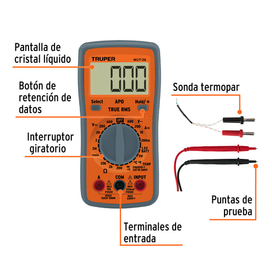 Proveedor:TruperMultimetro profesional con RMS verdadero y auto rango, 100361Instrumento de medición con cuerpo de ABS Escala de circuito integrado con convertidor (alterna / directa) doble integrado como centro...