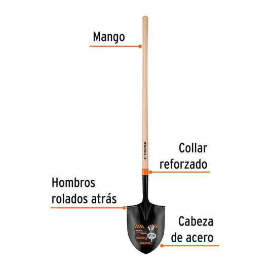 Proveedor:TruperPala redonda T-2000, mango largo 45', Truper Caja con 3, 17175Cabeza de acero al carbono Mango largo de madera con acabado enlacado Collar reforzado que proporciona un ensamble robusto Hombros rolados atrás...