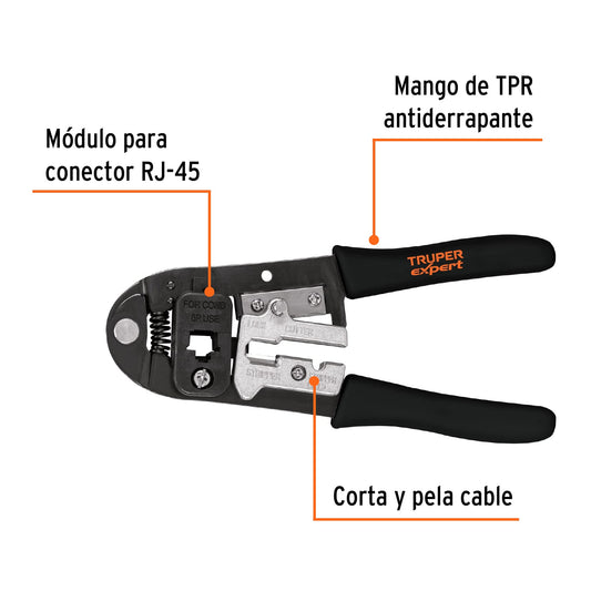 Proveedor:TruperPinza 8' ponchadora para cables RJ-45, 8 contactos, Truper Caja con 3, 18342Cuchilla de acero SK5 Mango cubierto de TPR antiderrapante Corta, pela e instala cables conectores RJ-45 Uso en electrónica, telecomunicaciones y redes...
