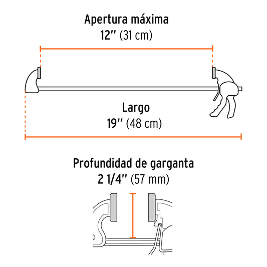 Proveedor:TruperPrensa de ajuste rápido de 12'con cuerpo de nylon, Truper Caja con 2, 100141Cuerpo de nylon y barra de acero Profundidad de garganta 2 1/4" Apertura máxima de 12" Almohadillas de silicón removibles...