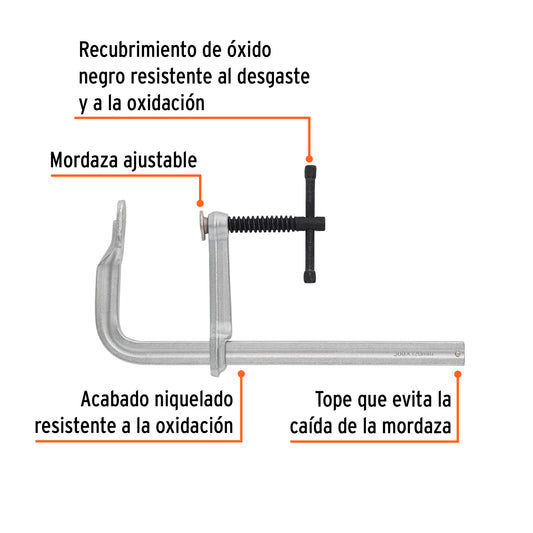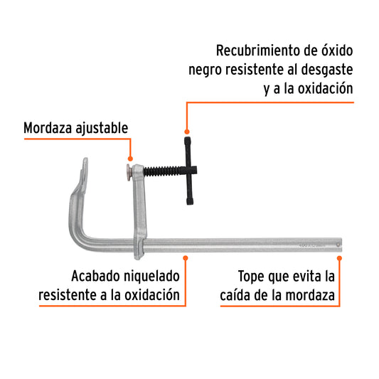 Proveedor:TruperPrensa rápida tipo 'F' 8', uso rudo, Expert Caja con 2, 103160Cuerpo y mordazas de acero forjado para mayor durabilidad Profundidad de garganta 4 3/4" Apertura máxima 8" Tornillo robusto con...