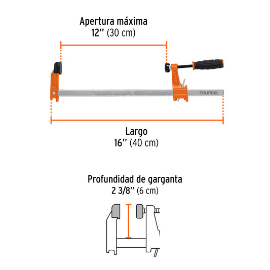 Proveedor:TruperPrensa rápida tipo 'F' 16', uso rudo, Expert, 103162Cuerpo y mordazas de acero forjado para mayor durabilidad Profundidad de garganta 4 3/4" Apertura máxima 16" Tornillo robusto con...