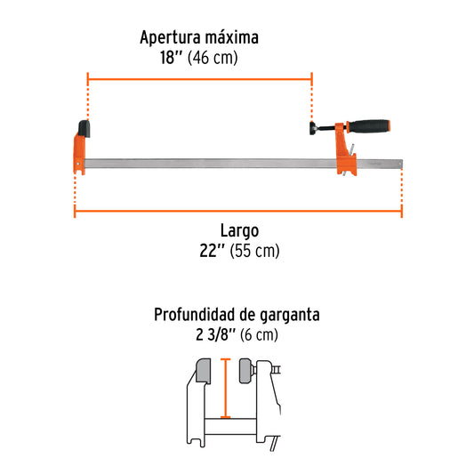 Proveedor:TruperPrensa rápida tipo 'F' 18', uso ligero, Truper Caja con 2, 103200Mordazas de hierro nodular y barra de acero ranurada para una mejor sujeción Profundidad de garganta 2 3/8" Apertura máxima...