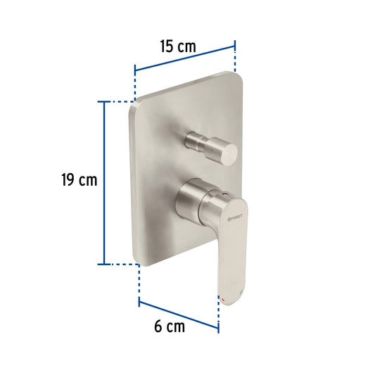Proveedor:FosetMonomando satín para regadera o tina con desviador, Foset, 45185Fabricado en latón para máxima duración Maneral metálico tipo palanca Cartucho cerámico de suave y fácil apertura